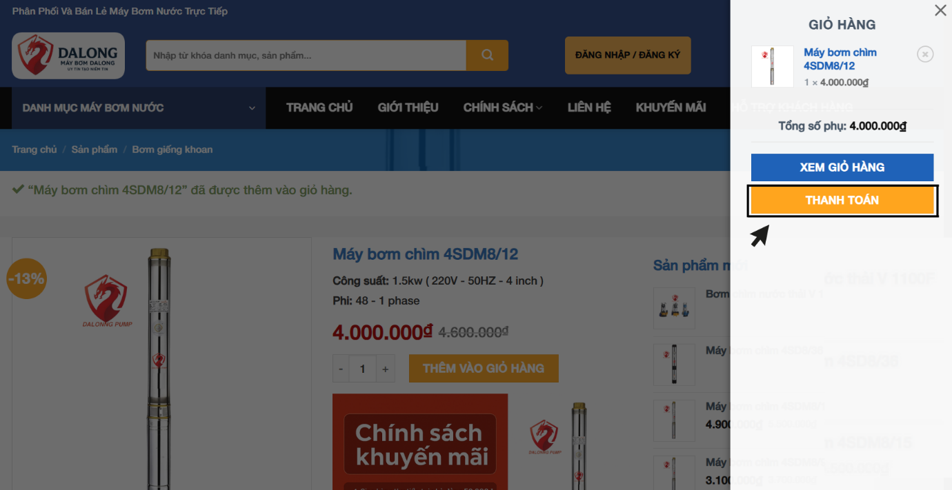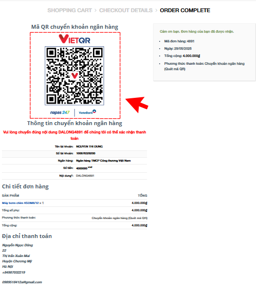 Sau khi nhấn vào nút đặt hàng sẽ hiện ra phương thức thanh toán, hãy chuyển khoản đặt cọc vào tài khoản hiện trên màn hình và lưu ý nội dung chuyển khoản hãy ghi là: DALONG4891.
