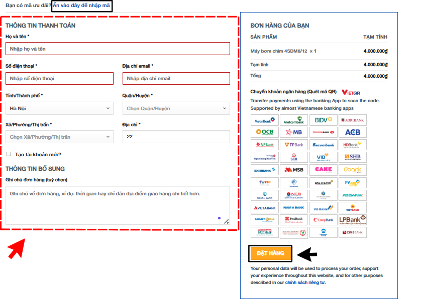 Tại trang thanh toán, điền đầy đủ thông tin vào các ô, đặc biệt là địa chỉ, SĐT, … và nếu bạn có mã giảm giá hãy nhấn vào “Ấn vào đây để nhập mã“ và sau khi hoàn thành hết phần ghi thông tin khách hàng hãy nhấn vào nút “Đặt hàng“.